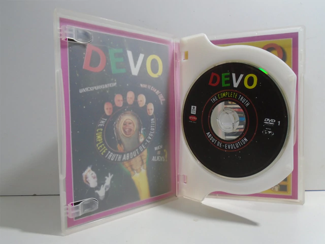 Músicas: The Complete Truth About De-Evolution / Devo Corporate Anthem / In The Beginning Was The End: The Truth About De-Evolution / Satisfaction / Come Back Jonee / The Day My Baby Gave My A Surprise / Worried Man / Whip It / Girl U Want / Freedom Of Choice / Through Being Cool / Love Without Anger / Beautiful World / Time Out For Fun / Peek-A-Boo / Thats Good / Disco Dancer / Post Post-Modern Man / Post Post-Modern Man (Rocky Schenk Re-Mix) / Extra Features / Commentary Track / Chuck Statler Interview / The Tour Film / Early Live "Gigs / Photos / The Deal / Albums, Singles, CDs / Posters / DEVO-Wear And T-Shirts / Buttons, Pins, Badges / Miscellaneous De-evolution / Kindred Spirit / Laserdisc Production Credits / Color Bars / Mongoloid, A Film By Bruce Conner / Devo Live / Whip It / Girl U Want / Satisfaction / Uncontrollable Urge / Blockhead / Mongoloid / Jocko Homo / Smart Patrol / Mr. DNA / Gut Feeling / Slap Yer Mammy / Gates Of Steel / Come Back Jonee